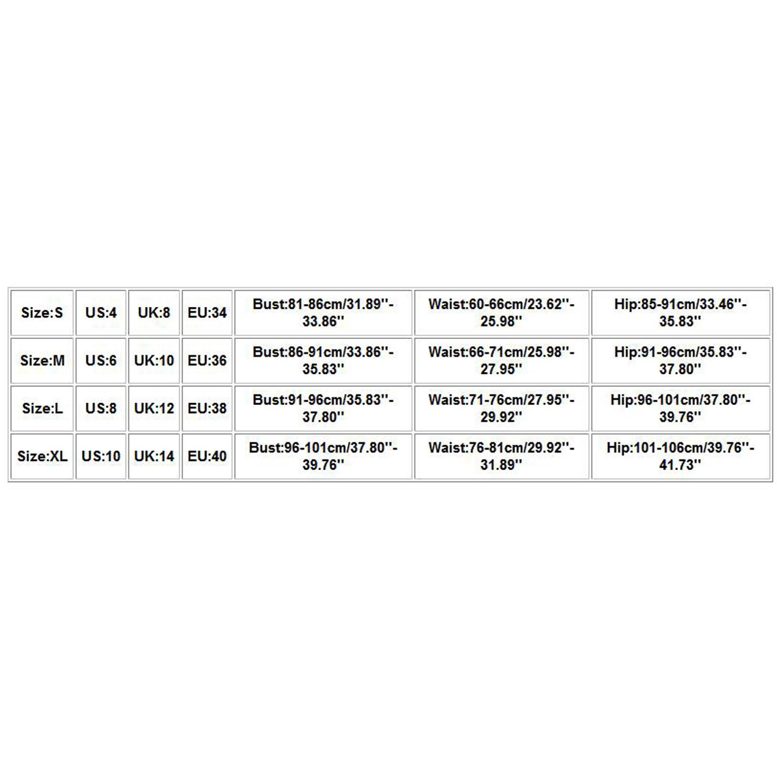| Size | US | UK | EU | Bust | Waist | Hip |